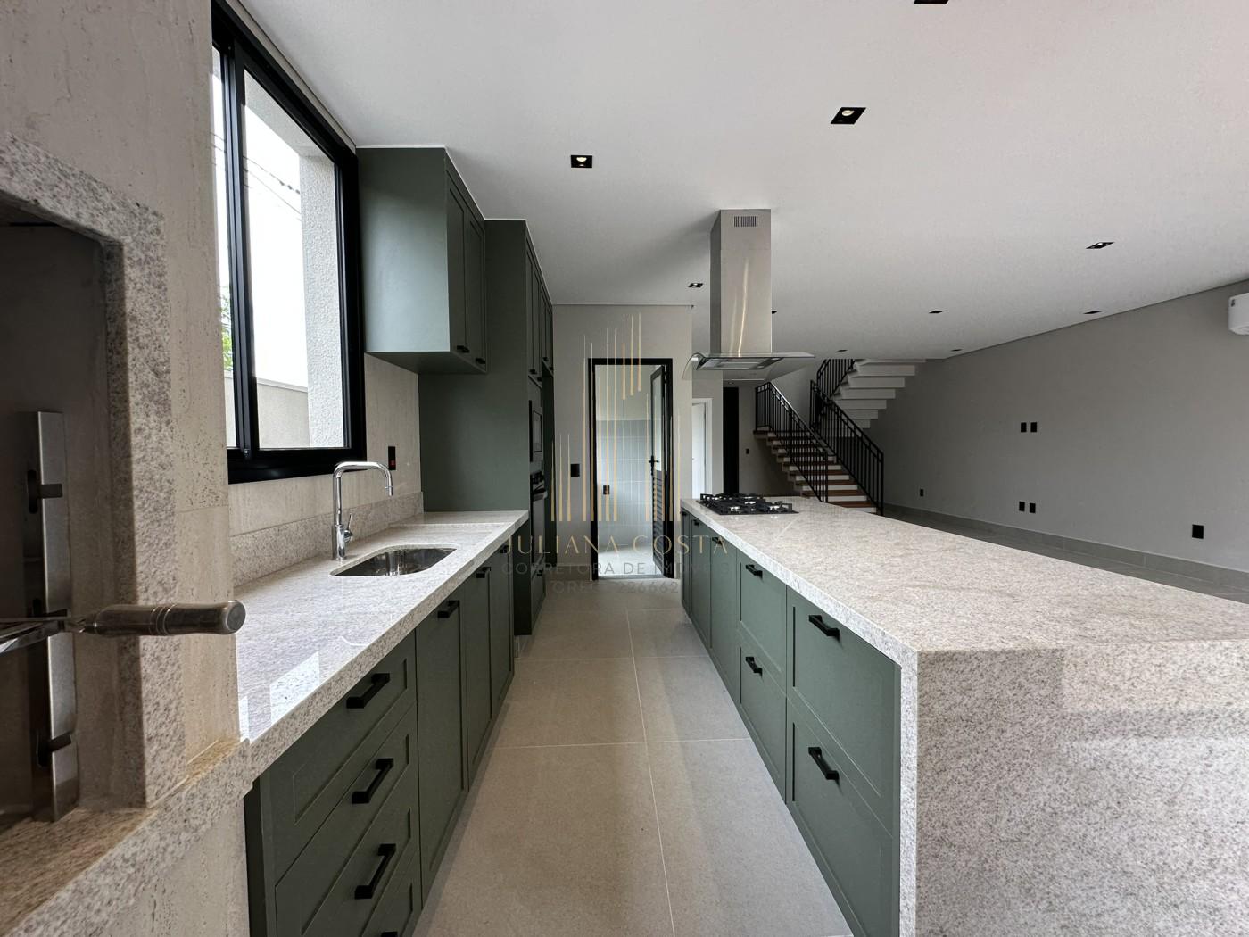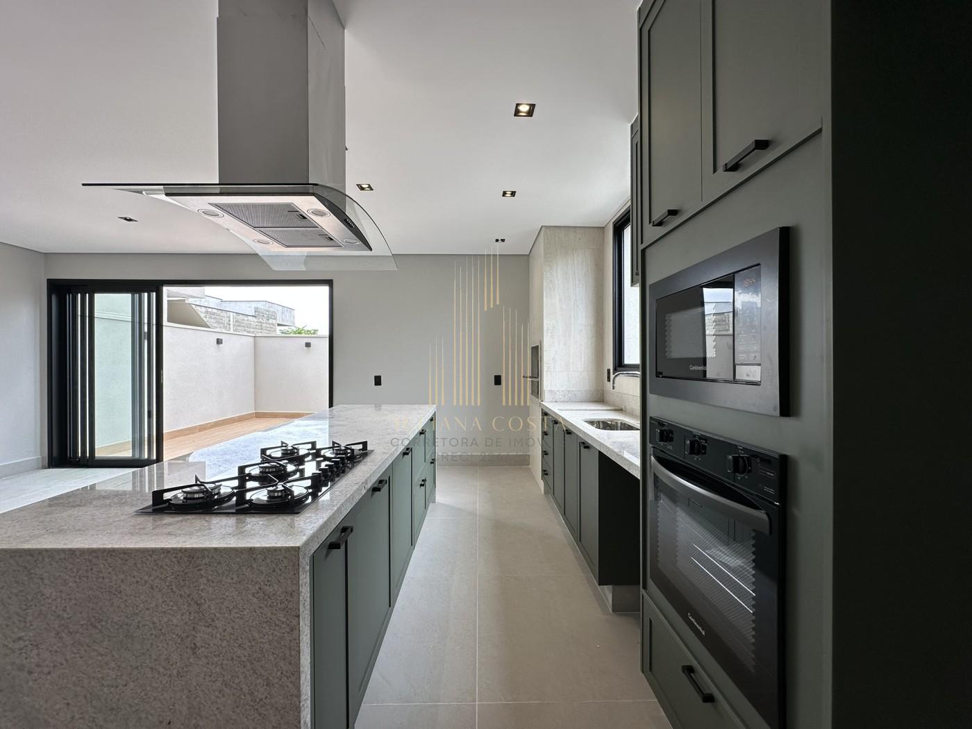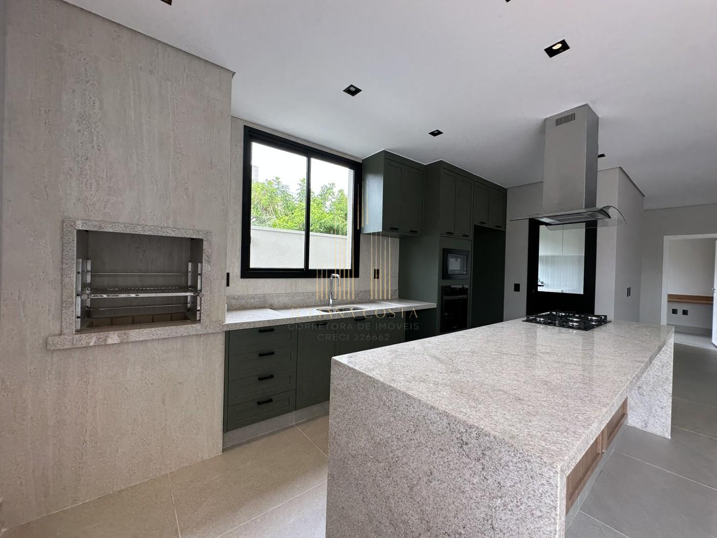 • Cozinha gourmet com churrasqueira integrada, planejados, ilha, cooktop, coifa e forno