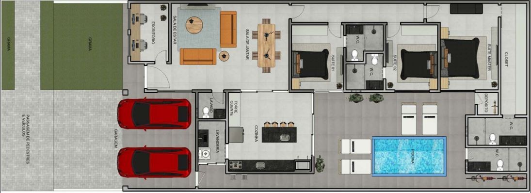 • 3 Suítes, sendo uma master (todos com persianas automatizadas e planejados)• Cozinha integrada com área gourmet
